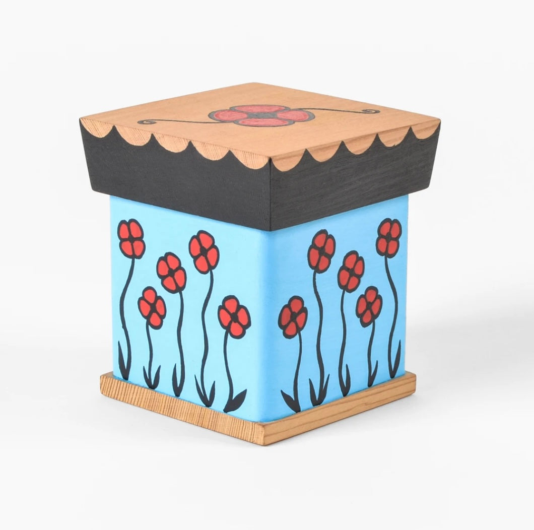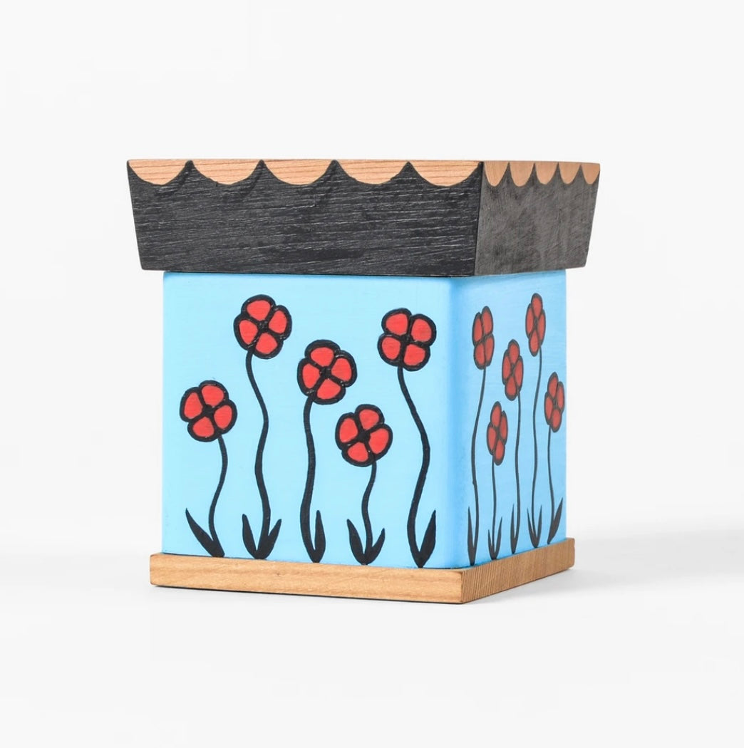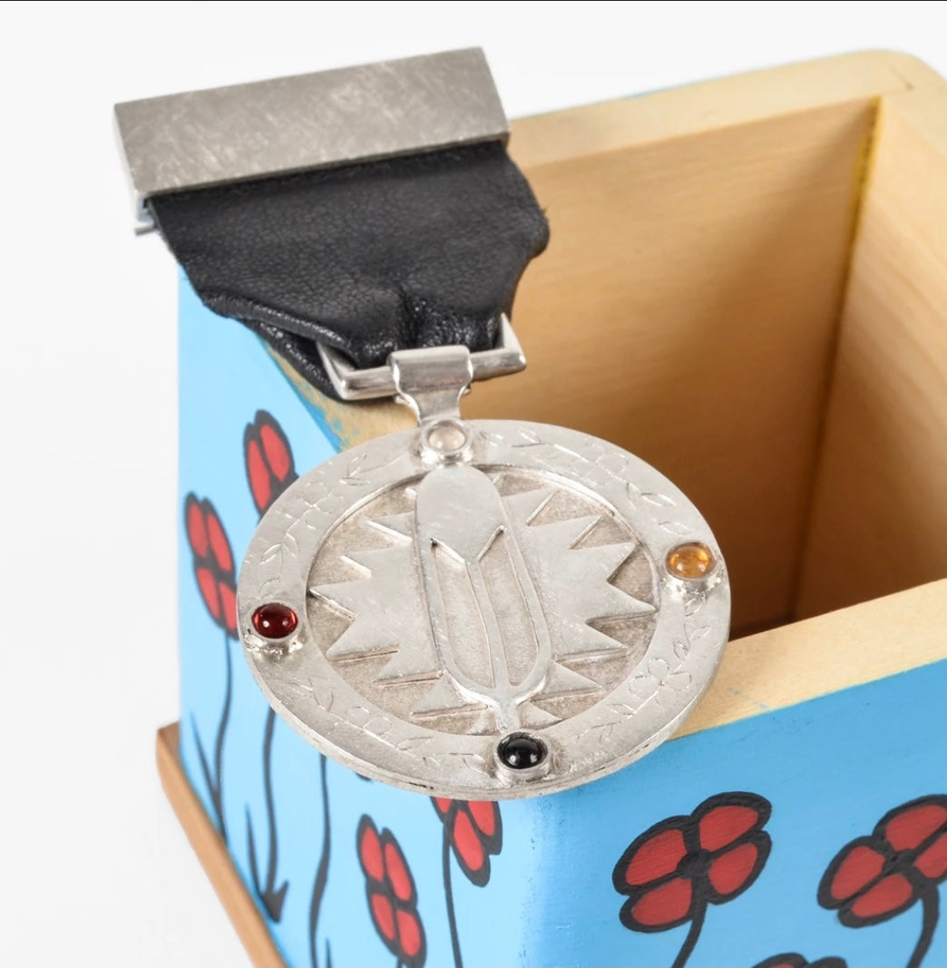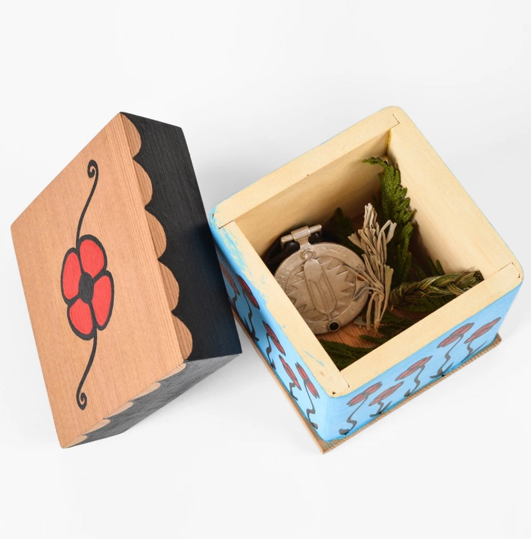 Red and yellow cedar, acrylic, sage, sweetgrass, cedar bough, sterling silver metal.