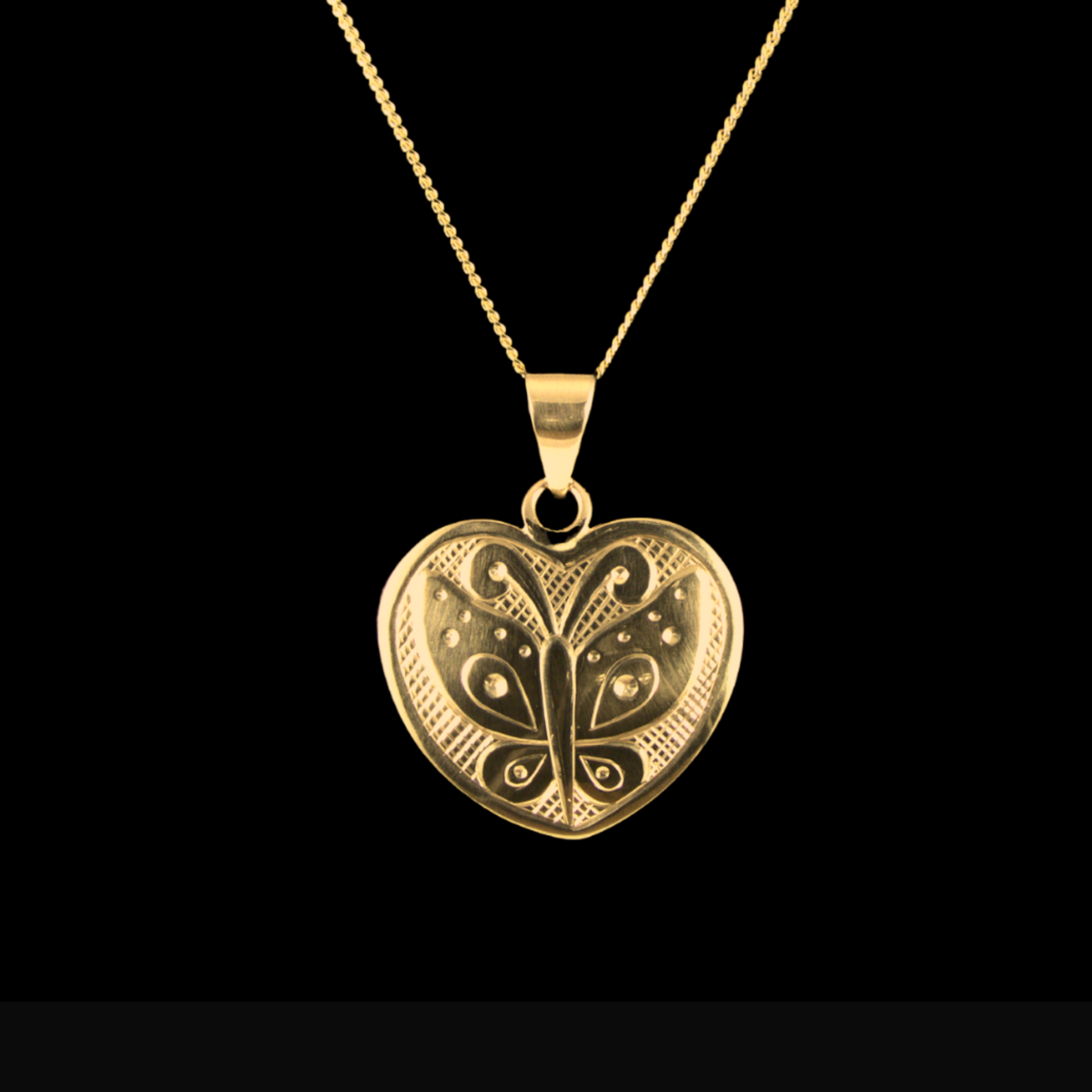 Butterfly Design Hand Engraved 7/8” Gold 14k Heart Pendant - SOLD