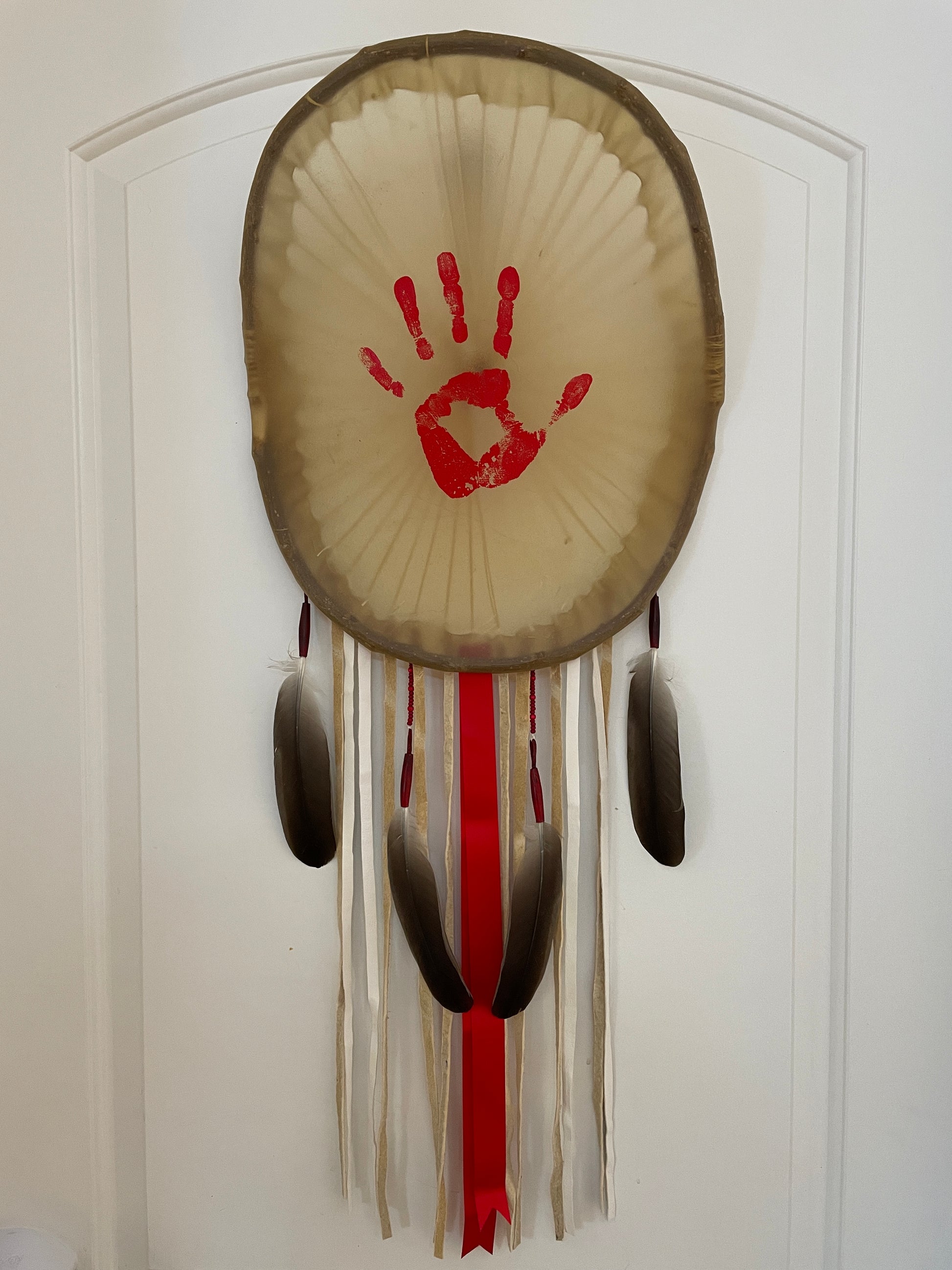 Shields are traditionally used for protection, and in more contemporary time, they are used to symbolically protect the home or space in which they are hung. This series of traditional rawhide shields are decorated with symbols that represent the struggles with are experiencing in recent years, touching on a variety of contemporary issues connected to the pandemic and reconciliation.
