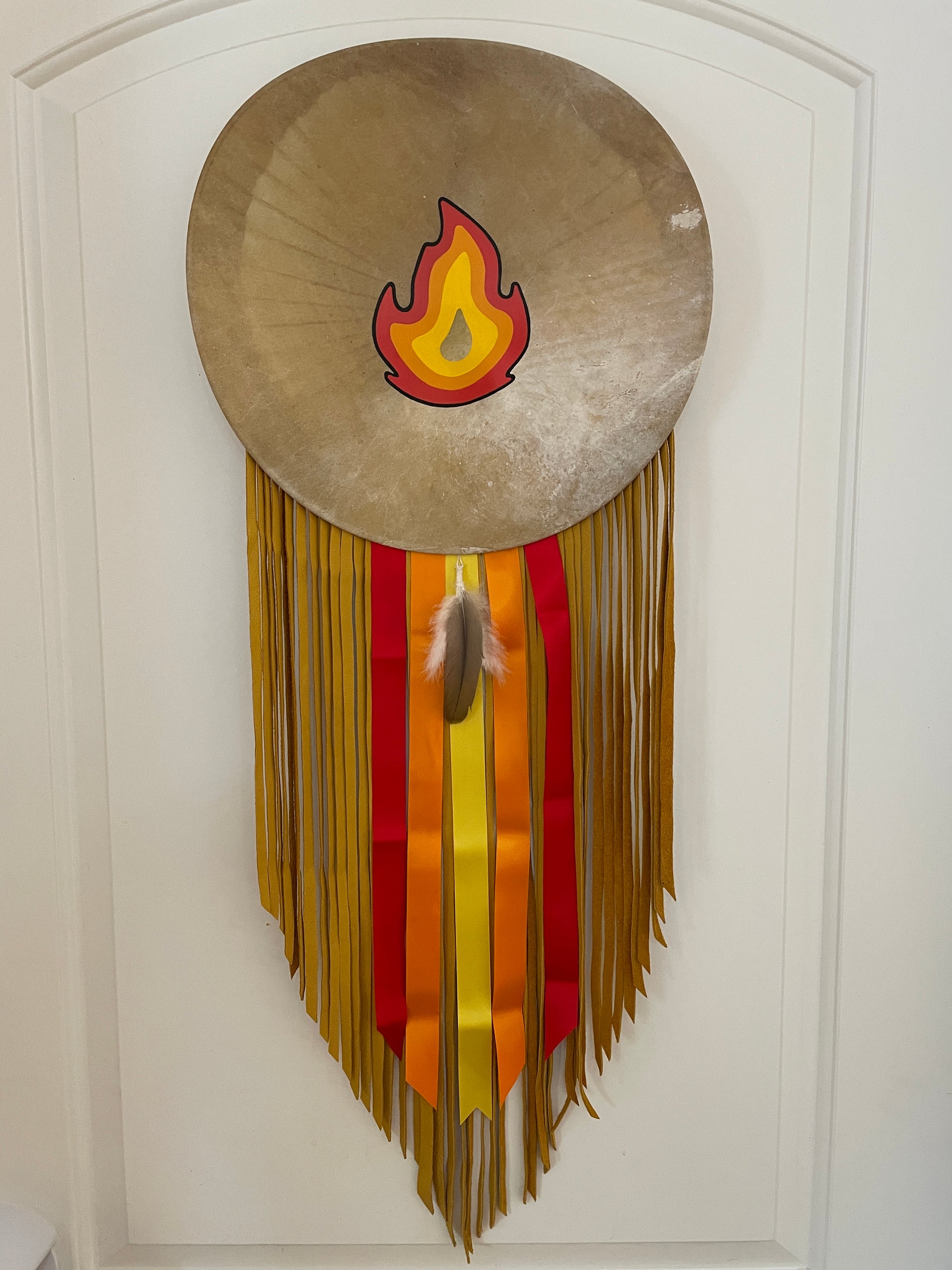 Shields are traditionally used for protection, and in more contemporary time, they are used to symbolically protect the home or space in which they are hung. This series of traditional rawhide shields are decorated with symbols that represent the struggles with are experiencing in recent years, touching on a variety of contemporary issues connected to the pandemic and reconciliation.