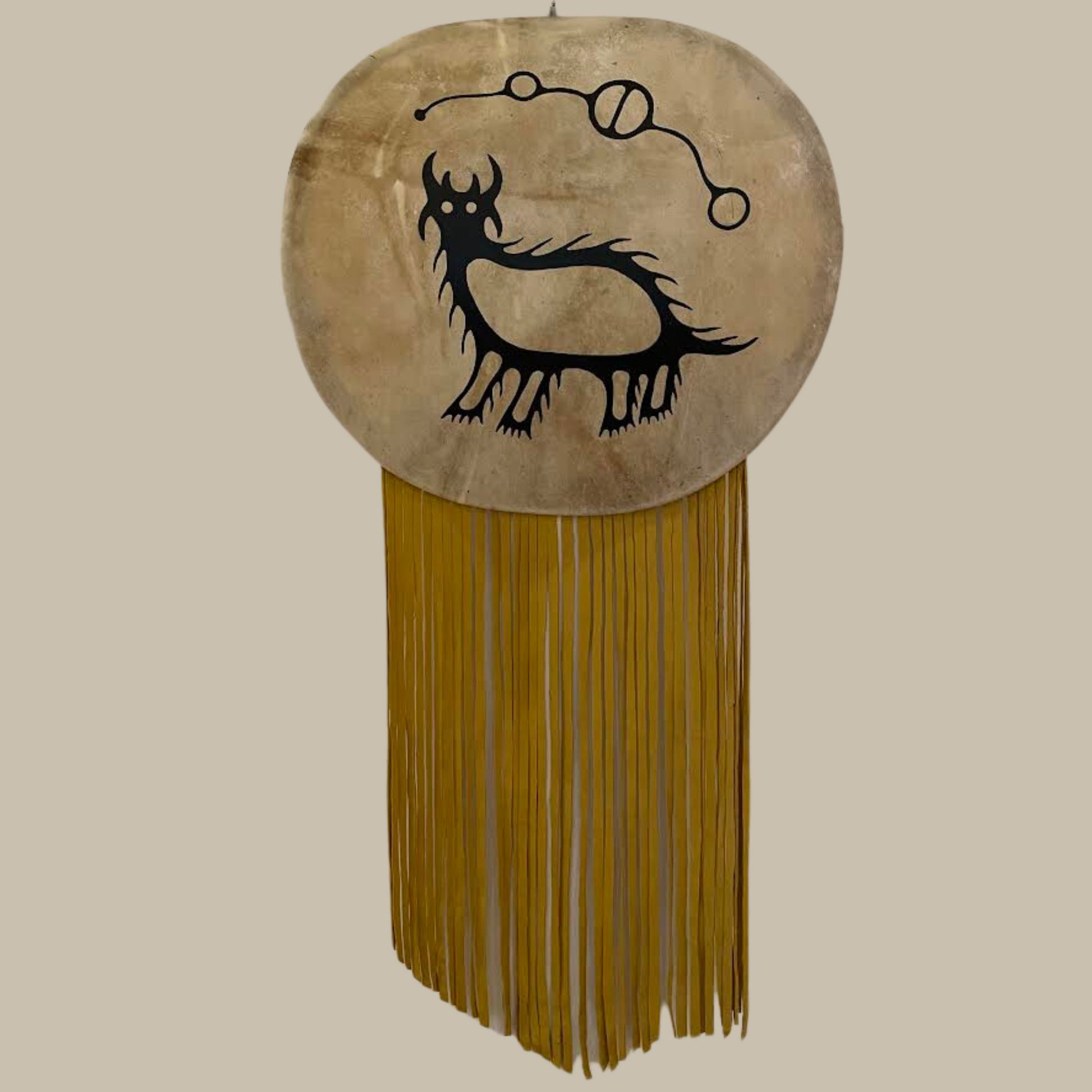 This piece is a powerful representation of Anishinaabe culture, meticulously crafted with elk rawhide, a brass ring, and elk leather fringe.