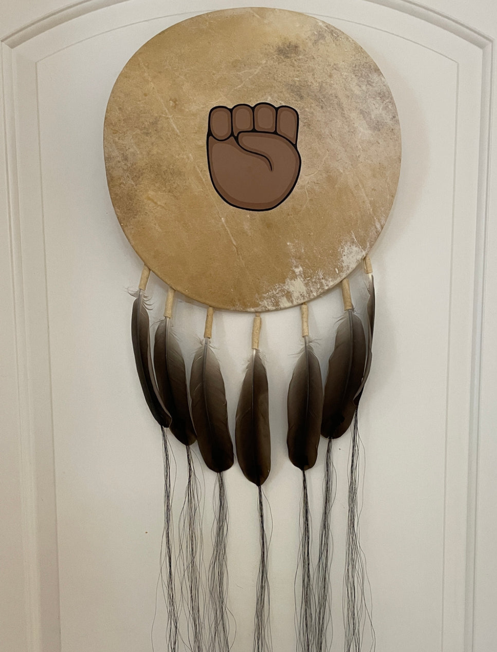 Shields are traditionally used for protection, and in more contemporary time, they are used to symbolically protect the home or space in which they are hung. This series of traditional rawhide shields are decorated with symbols that represent the struggles with are experiencing in recent years, touching on a variety of contemporary issues connected to the pandemic and reconciliation.